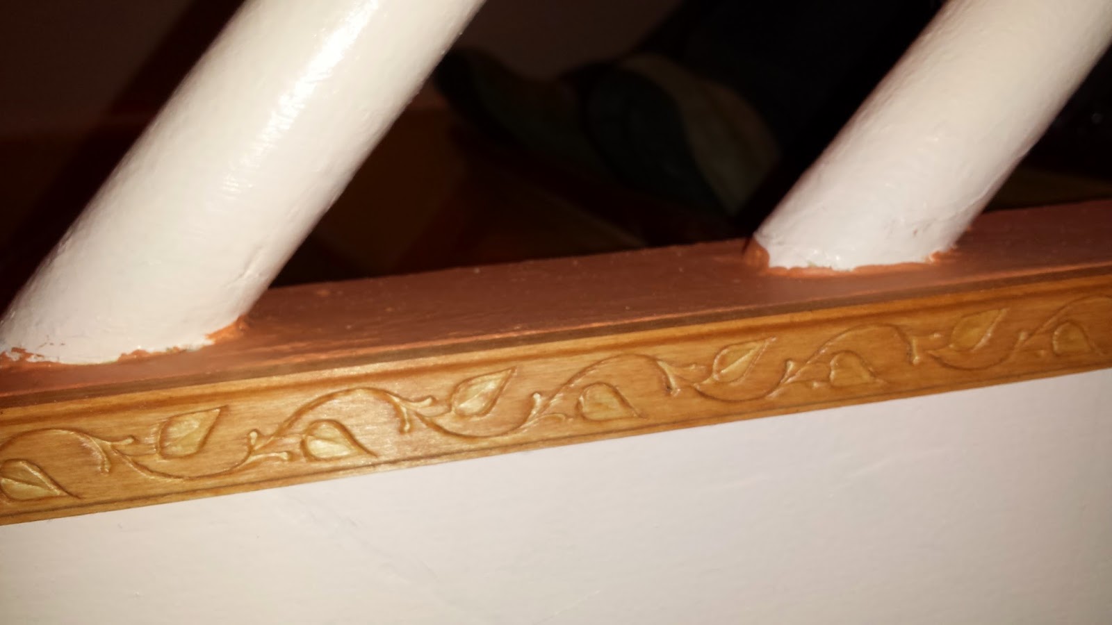 When the treads are cleaned, possibly sanded, and re-stained, the up stairs doors and trim are painted, the ceiling at the top of the stairs gets a second coat, and stringers are repainted, Natalie will be painting the risers, just like seen below...